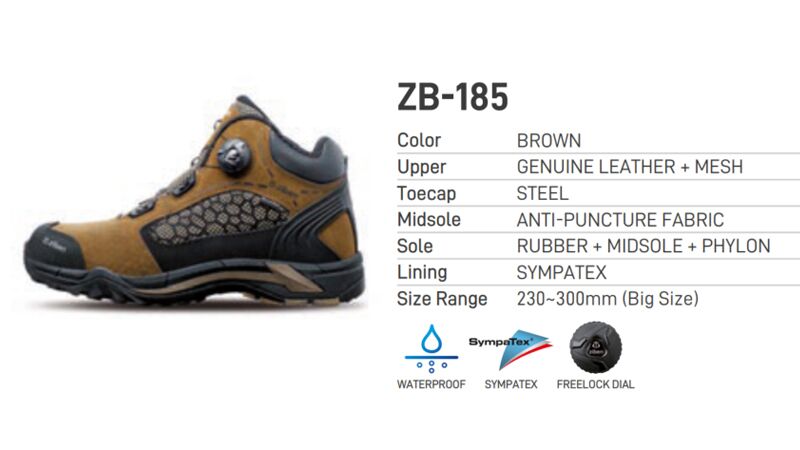 GIÀY BẢO HỘ ZIBEN 185 là một trong các mã sản phẩm cao cấp của hãng giày Ziben, được sử dụng khá phổ biến, ngoài những chất liệu và tính năng thông thường của một đôi giày hãng Ziben như đế cao su kết hợp với các chất liệu sympatex, phần trên giày là kết hợp giữa da thật và lưới, kiểu dáng thời trang. Ngoài ra, phần trên giày là kết hợp giữa da cao cấp và lưới, kiểu dáng thời trang, hệ thống khóa xoay rất tiện lợi. Ngoài ra, GIÀY BẢO HỘ ZIBEN 185 có cấu tạo và đặc điểm nổi bật là chức năng thông hơi thoáng khí (ventilation)