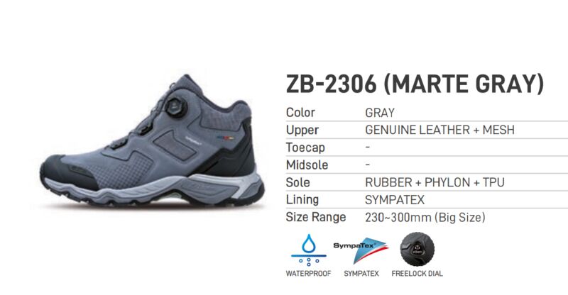 GIÀY BẢO HỘ ZIBEN 2306 là một trong các mã sản phẩm cao cấp của hãng giày Ziben, được sử dụng khá phổ biến, ngoài những chất liệu và tính năng thông thường của một đôi giày hãng Ziben như đế cao su kết hợp với các chất liệu sympatex, phần trên giày là kết hợp giữa da thật và lưới, kiểu dáng thời trang. Ngoài ra, phần trên giày là kết hợp giữa da cao cấp và lưới, kiểu dáng thời trang, hệ thống khóa xoay rất tiện lợi.