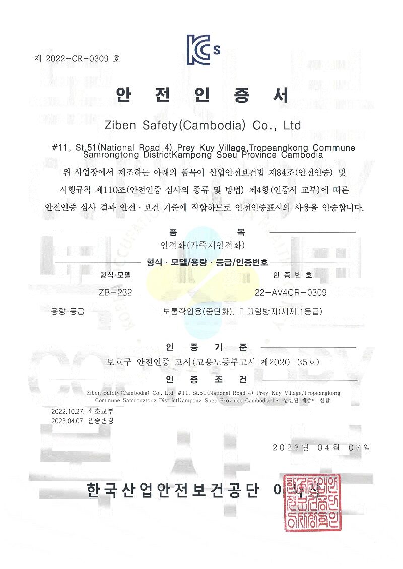CHỨNG NHẬN AN TOÀN CỦA GIÀY BẢO HỘ ZIBEN 232