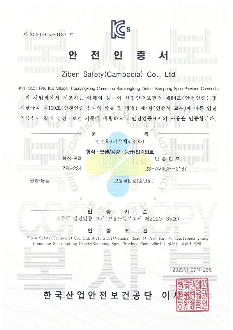 CHỨNG NHẬN AN TOÀN CỦA GIÀY BẢO HỘ ZIBEN 234