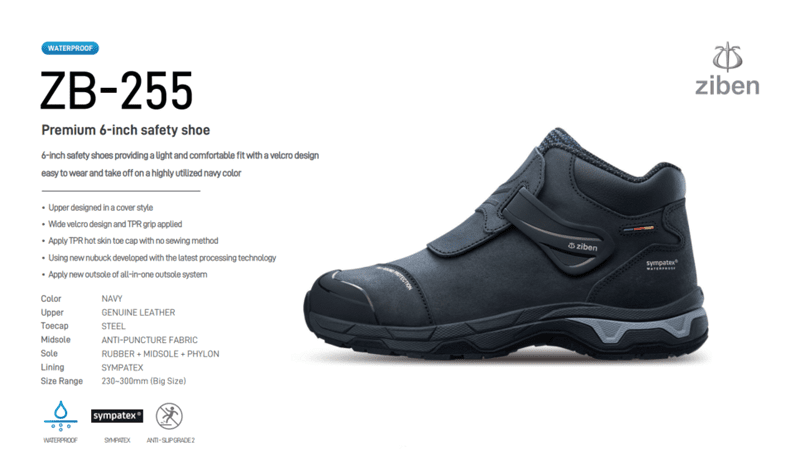 Ziben được biết đến là 1 thương hiệu Bảo hộ lao động số 1 đến từ Hàn Quốc. Và giày bảo hộ Ziben 255 là một trong các mã sản phẩm cao cấp của hãng.