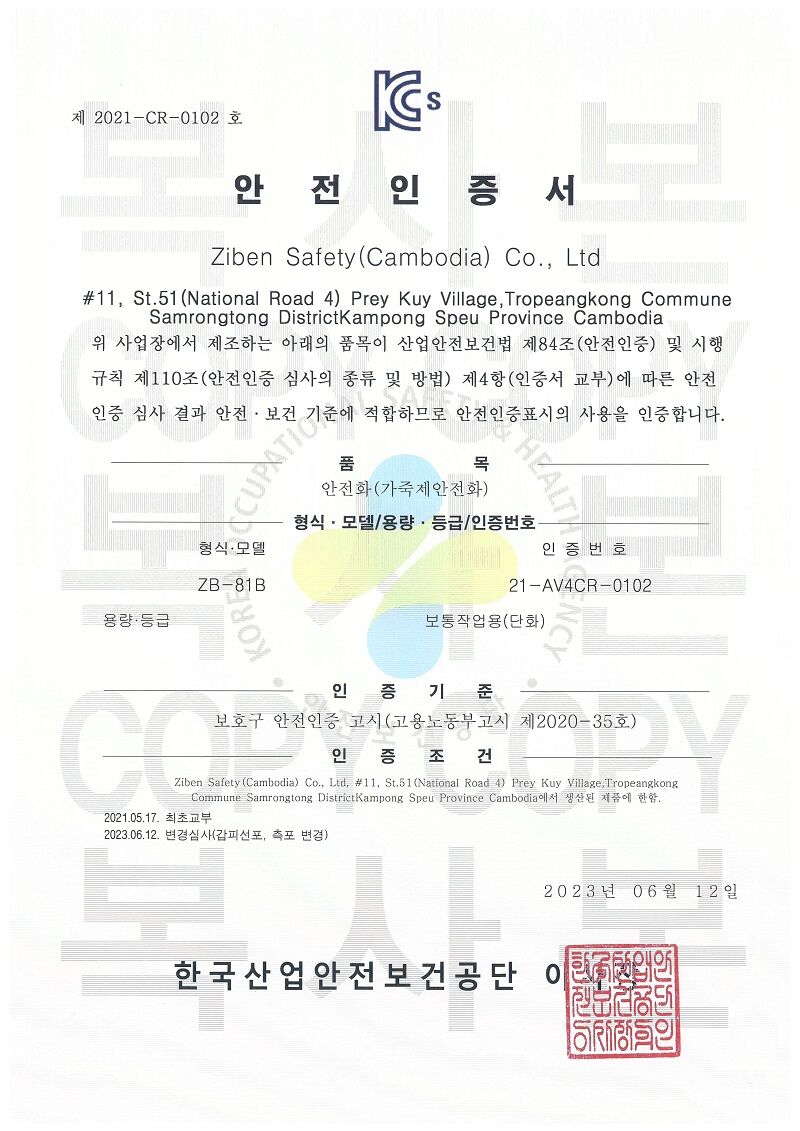 CHỨNG NHẬN AN TOÀN CỦA GIÀY BẢO HỘ ZIBEN 81B