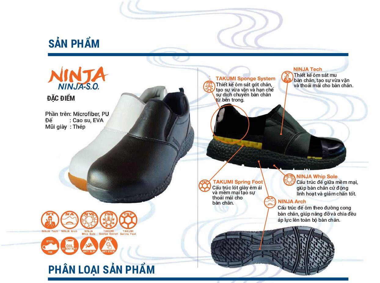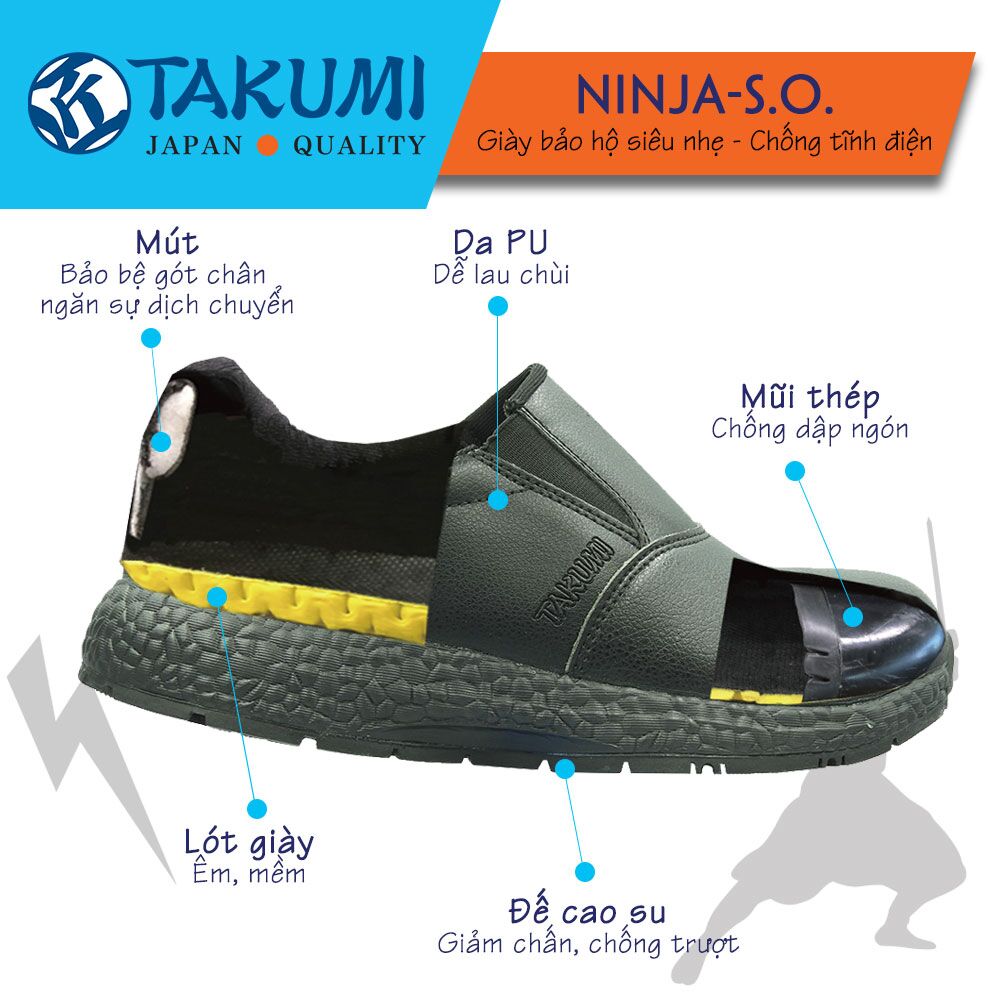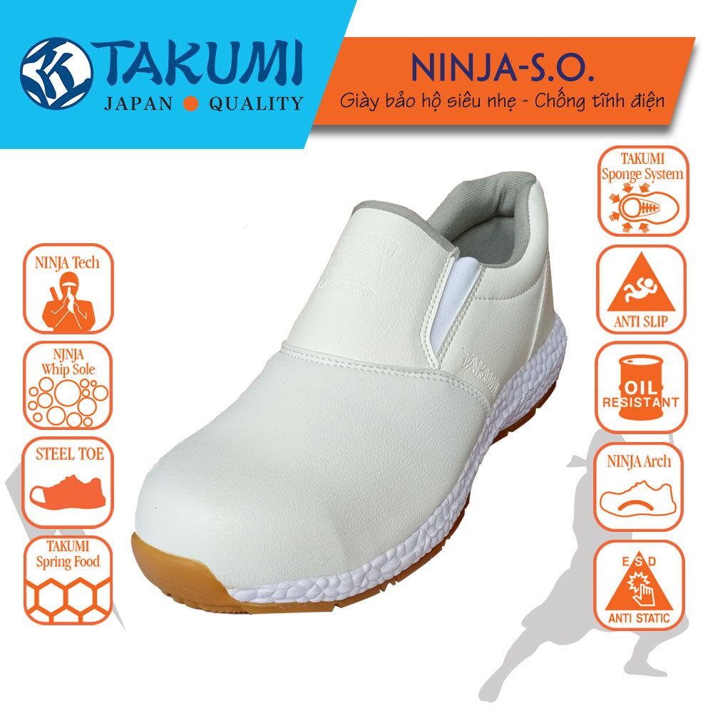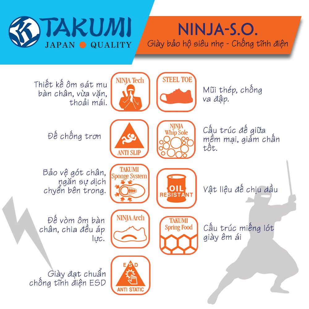 – Ngoài ra Takumi Ninja-SO còn là mẫu giày đạt chuẩn ESD về chống tĩnh điện nên phù hợp với môi trường phòng sạch, bếp, công xưởng.