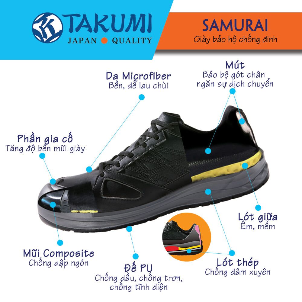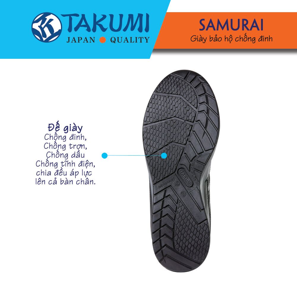 Công nghệ bước chân Samurai: Với công nghệ này Takumi mang đến khả năng chống tĩnh điện, chống trơn và di chuyển dễ dàng và thoải mái hơn.